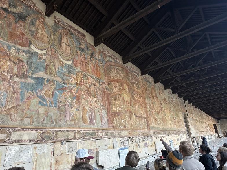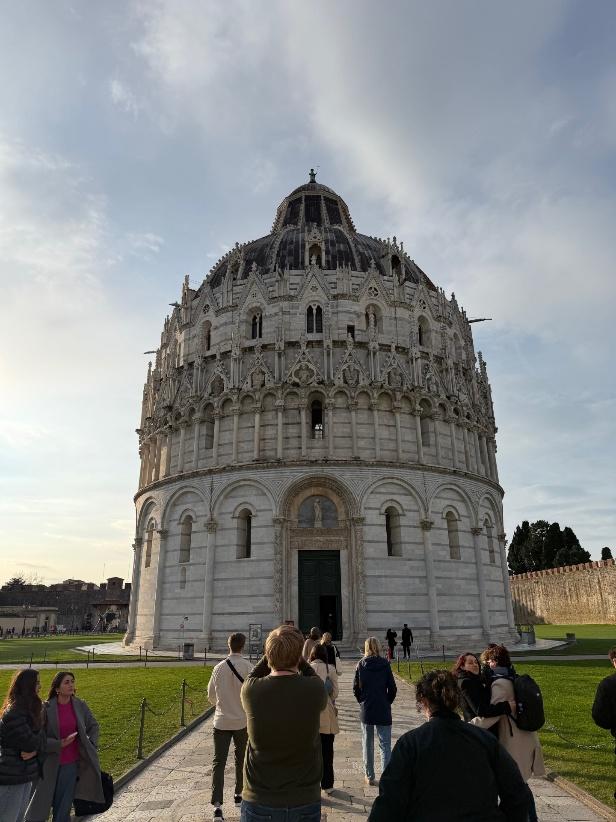 Buonasera everyone, today we had the honour to travel to Pisa and see the Leaning Tower, Cathedral, Baptistery of San Giovanni, and Monumental Cemetery. We started the morning by making our way down to Hotel Grifone’s breakfast buffet and then traveled the long distance two rooms down to our new meeting space for a class on the engineers and advancements of the Renaissance era (Thanks, Brynn, Larissa, and Maddy) along with art analysis. After wrapping up, we loaded up the bus and left Florence through the rolling hills and mountains of Tuscany towards Pisa